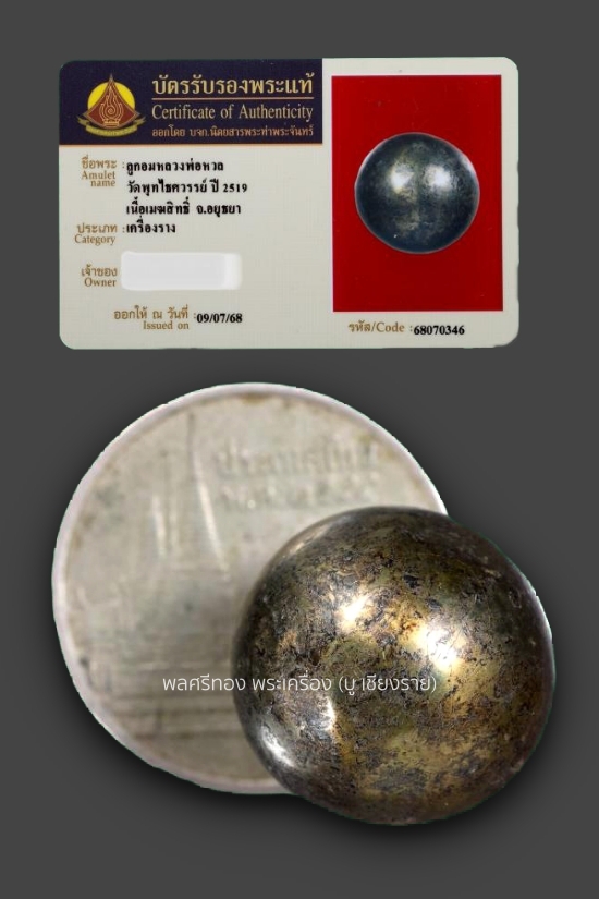 ลูกอมหลวงพ่อหวล วัดพุทไธศวรรย์ จ.พระนครศรีอยุธยา เนื้อเมฆสิทธิ์ สร้างปี 2519 (บัตรรับรองนิตยสารพระท่าพระจันทร์) ประวัติการสร้างชัดเจน สวยเดิมทุกประการ